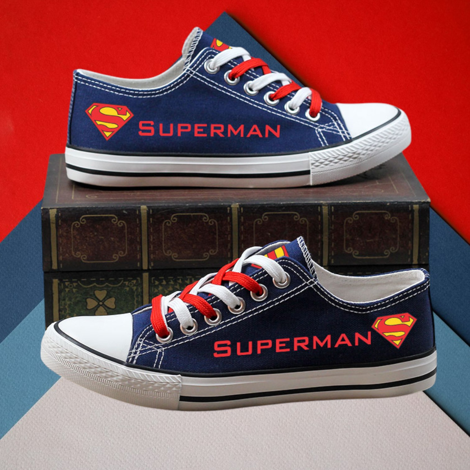 The blue and black canvas upper contrasts perfectly with a black-and-white rubber sole, creating a clean, timeless look. The bold red “Superman” lettering and iconic “S” shield logo represent power, courage, and hope, while the red and white laces add a vibrant, festive touch ideal for the holiday season.