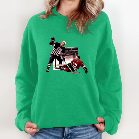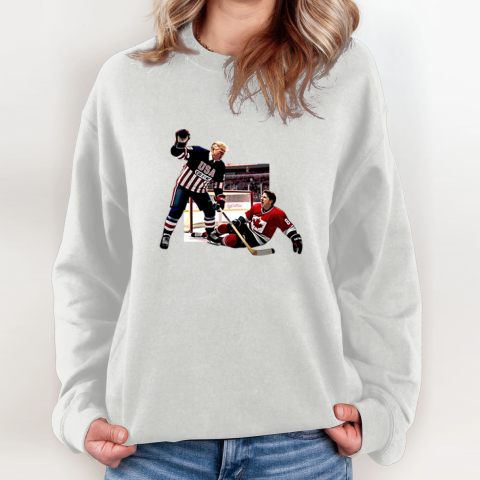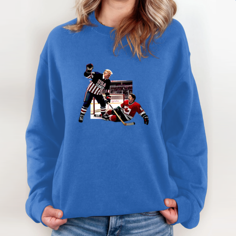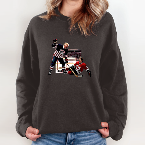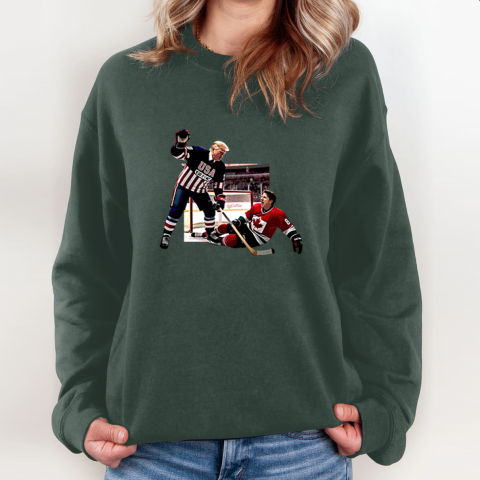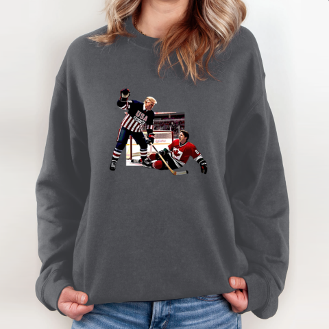 This hilarious t-shirt showcases a bold design featuring Donald Trump defeating Justin Trudeau in a hockey match. More than just a sports moment, this image serves as a playful yet symbolic representation of Trump “winning” over Trudeau in political, ideological, and economic debates.