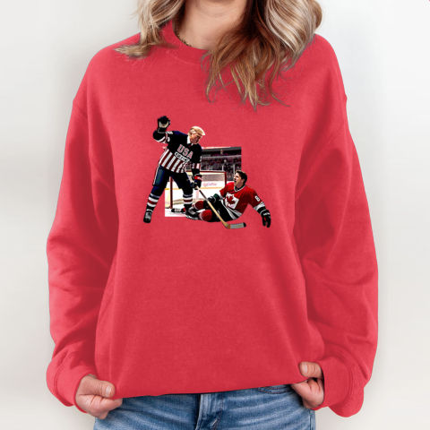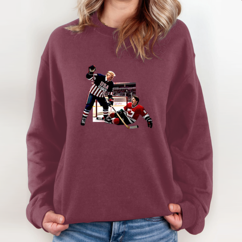Perfect for Trump supporters, this funny Trump vs. Trudeau hockey shirt is a bold statement piece that praises Trump’s leadership while critiquing Trudeau’s policies. Ideal for political discussions, rallies, or just a fun conversation starter, this shirt is sure to spark debate and laughter!